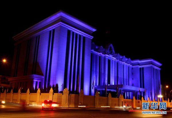 10月24日,柬埔寨金边和平宫亮起蓝灯,纪念联合国成立70周年。 10月24日是联合国日,同时也是《联合国宪章》生效和联合国正式成立70周年纪念日,全球地标性建筑被联合国的官方颜色——蓝色点亮,以庆祝联合国成立70周年。新华社发(索万纳拉摄)