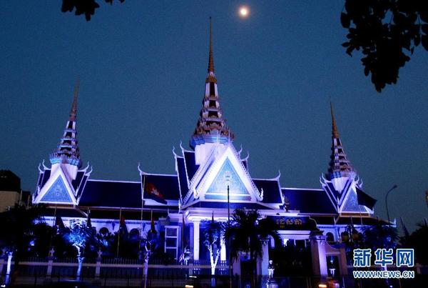 10月24日,柬埔寨金边国会亮起蓝灯,纪念联合国成立70周年。 10月24日是联合国日,同时也是《联合国宪章》生效和联合国正式成立70周年纪念日,全球地标性建筑被联合国的官方颜色——蓝色点亮,以庆祝联合国成立70周年。新华社发(索万纳拉摄)