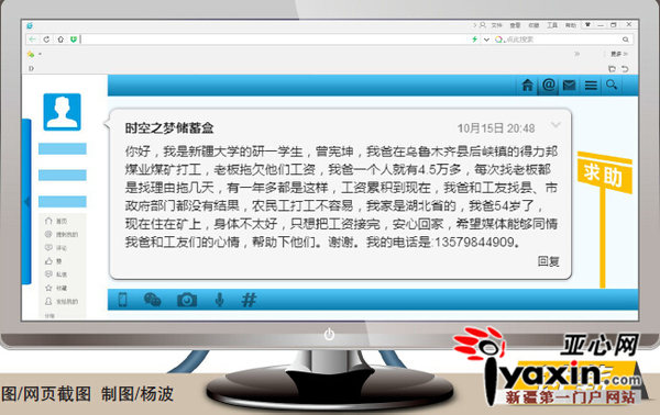亚心网讯(记者刘新草代筱晔)“我父亲在乌鲁木齐县后峡镇的得力邦煤矿打工,老板拖欠他们的工资,我爸一人就有4万多元,他今年54岁了,身体也不是很好,母亲因病在家,现在只希望他能把工资结完,安心回家。”正在新疆大学读研究生的曾宪坤在得知父亲工资已被拖欠两年后,通过网络帮父亲讨薪,寻求媒体的帮助。