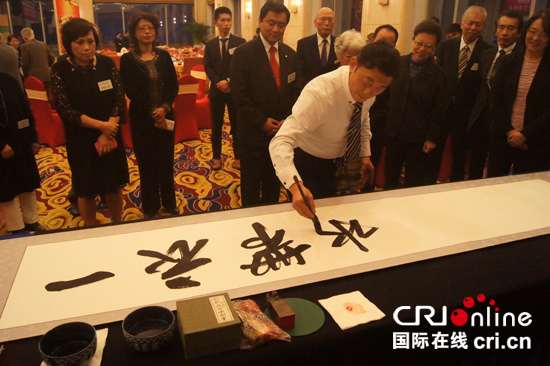 北京书法学校校长、北京市民间组织国际交流协会副会长湖滨题写“一衣带水” 摄影 李鷐