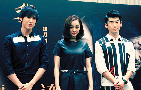 杨幂与片中演员赖艺、刘芮麟(右)亮相深圳