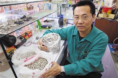 丰台区三环新城超市发超市,不到3平方米的钟表修理柜台,50岁的修表师傅明文友戴着老花镜忙活着,身后的柜子里,“收藏”了他近3年来收集的“宝贝”——上万粒纽扣电池。