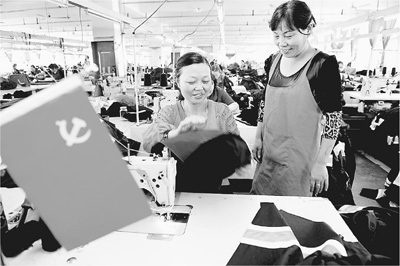 安徽淮南市加强非公党建助推企业发展,全市2003家独立法人非公企业全部建立党组织,发展党员252名,多数新发展的党员成为企业技术骨干。图为淮南市步瑞吉制衣有限公司党员职工陈丽(左)在党员示范岗上与工友交流缝纫技巧。