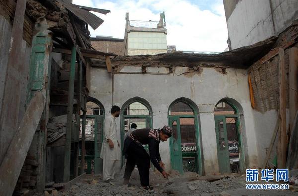 10月26日,在巴基斯坦白沙瓦,人们在强震后检查房屋废墟。据巴基斯坦当地媒体26日报道,当天发生的强烈地震已造成该国至少220人死亡、超过1200人受伤,大批房屋和建筑被毁。 新华社发(乌玛尔摄)