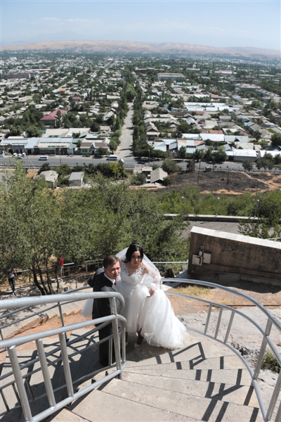 位于吉尔吉斯斯坦奥什的世界文化遗产苏莱曼山,一对新人在拍摄婚纱照,这里可以俯瞰整个奥什城市街景。