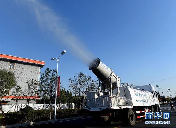 10月27日,多功能抑尘车在河北省大厂回族自治县进行喷雾抑尘。近日,河北大厂回族自治县引进一种新型多功能抑尘车,集洒水、除尘、治霾、冲洗道路等功能于一身,通过喷洒系统向空中发射水雾,将漂浮在空气中的污染颗粒物迅速降到地面,达到净化空气的效果。 新华社记者李晓果摄