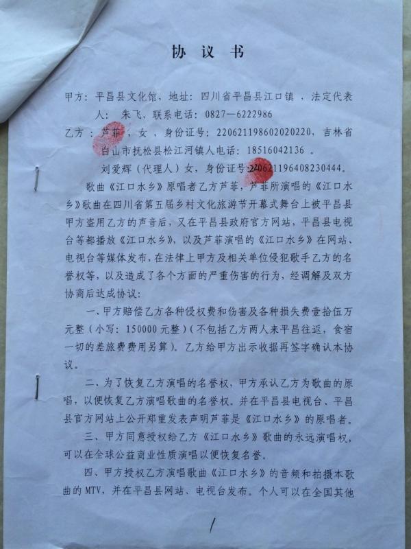 平昌县文化馆与歌手芦菲签订的协议书上称,在四川省第五届乡村文化旅游节开幕式上,确实存在盗用了芦演唱的《江口水乡》。