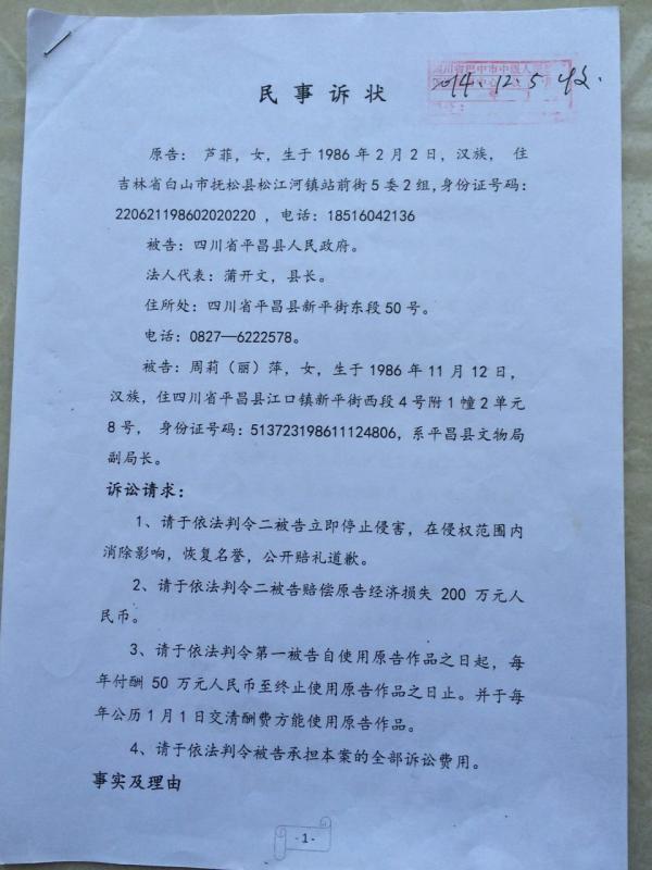芦菲状告平昌县人民政府和文物局副局长的起诉状。
