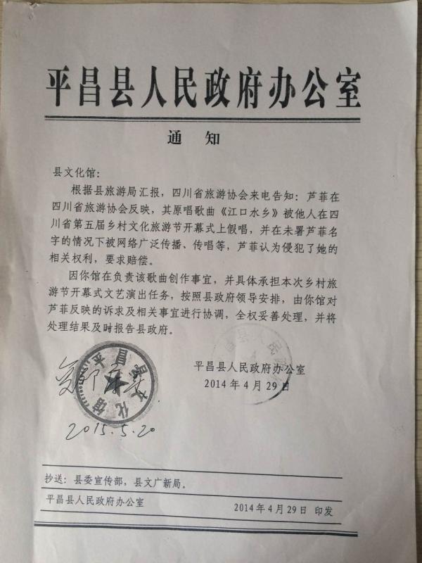 平昌县人民政府办公室向该县文化馆发通知,要求协调处理女歌手芦菲所反映的其原唱歌曲被假唱一事。