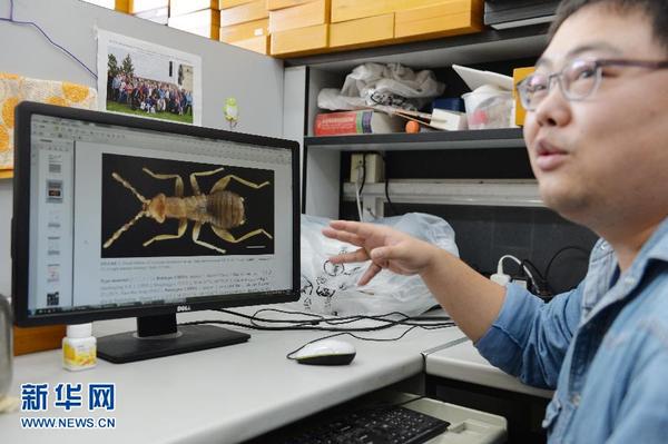 10月28日,上海师范大学生命与环境科学学院昆虫学研究室的青年教师殷子为博士在介绍“海南缺翅虫”。当日,上海师范大学宣布,该校生命与环境科学学院昆虫学研究室的青年教师殷子为博士等在我国海南省发现了昆虫新物种,并将其命名为“海南缺翅虫”。日前,殷子为博士等在国际动物分类学期刊《Zootaxa》发表了描述“海南缺翅虫”的学术论文。据了解,缺翅虫是一类稀有的原始昆虫,迄今全球仅记载1属39种,主要分布在赤道两侧的热带和亚热带地区。 新华社发(刘晓晶 摄)