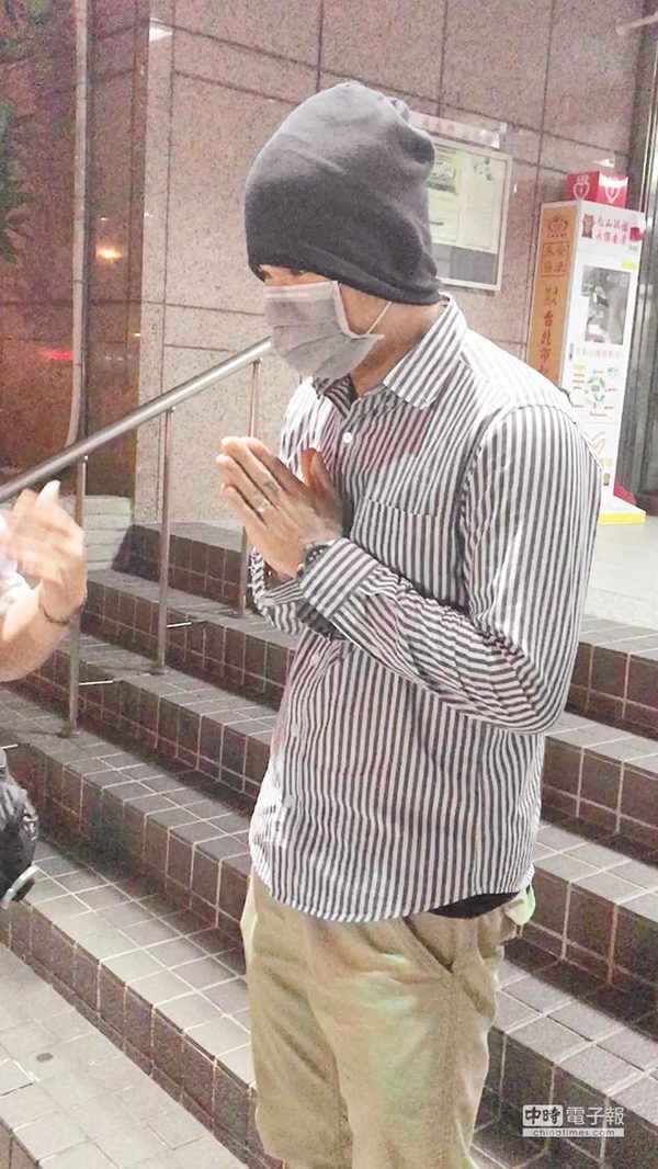 蔡姓男子,29日晚上北上到警局认领空拍机,并双手合十频频道歉。图片来源:台湾《中时电子报》