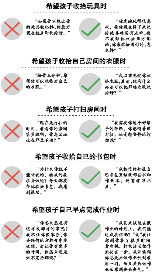 希望孩子自己听闹钟起床时,“如果能坚持自己起床,你就可以得到一部手机”可能是一种错误的话语方式。而在希望孩子努力学习时,正确的说法也许是“我明白你对自己的成绩不好也很难过,我相信你可以从中吸取教训,并制定如何做才能取得理想成绩”。