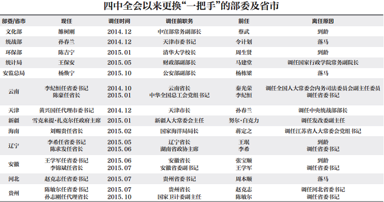 从去年10月召开十八届四中全会至今,已有5个部级单位更换了“一把手”,包括文化部、环保部、中央统战部、国家统计局和安监总局。