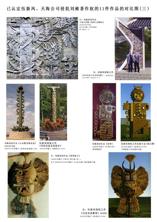 刘雍不服一审判决,2013年向贵州省高级人民法院提起上诉,称:一审判决既不对每件作品是否构成侵权进行逐一认证,也不对侵权事实进行分析评判,其关于伍新凤、天海公司不构成侵权的认定属于主观臆断。在一审审理过程中,刘雍对自己每件作品的创作时间、思路及创作过程都进行了说明,并出示了相关证据。而伍新凤、天海公司的作品完成时间均晚于刘雍,其对作品内涵的陈述也文不对题。一件作品的相似可能是不谋而合,但13件作品均相似就只能是抄袭。一审判决在事实认定和法律适用方面均存在错误,请求二审法院在查明事实的基础上,依法改判。”