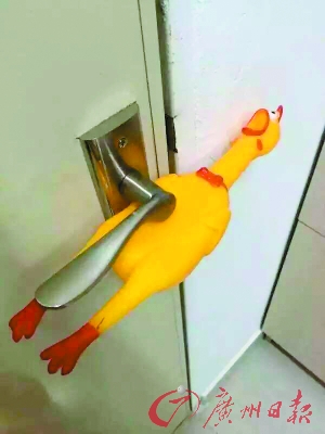 闻鸡起舞:在门把手下面卡上一个一按就会发声的小玩偶如小鸡,只要门把手一动,嘿嘿!
