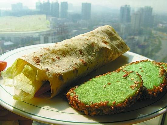 人们喜欢用吃米饭还是吃面来区分南方人和北方人,这在徐州可行不通,徐州人喜欢吃烙馍。烙馍是将死面擀成极薄的饼然后放在鏊子上烙熟而成,可是却有一种混合着柴火味道的小麦香气,而且口感劲道耐嚼,极锻炼牙口。