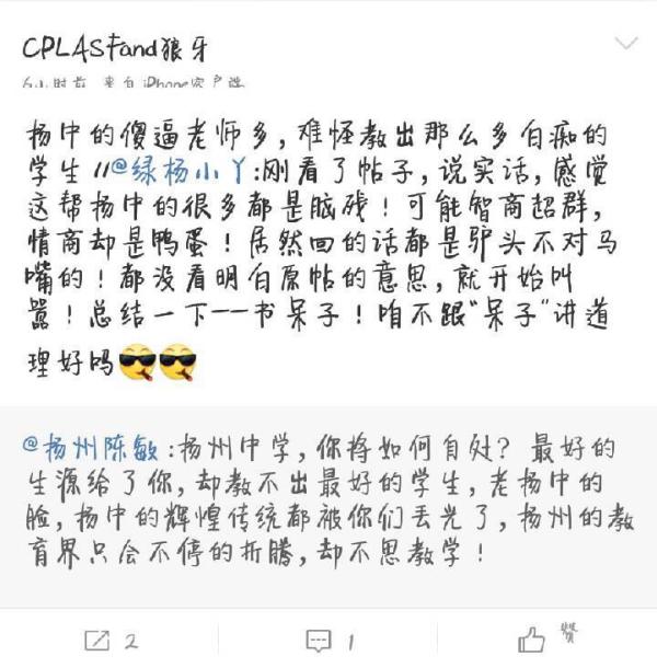 今年7月份,扬州一位网络“大V”@扬州陈敏因对扬州市2015年四星高中定向指标政策不满,在新浪微博上发布了一则批评当地著名中学的帖文:“扬州中学,你将如何自处?最好的生源给了你,却教不出最好的学生,老扬中的脸,扬州的辉煌传统都被你们丢光了……”
