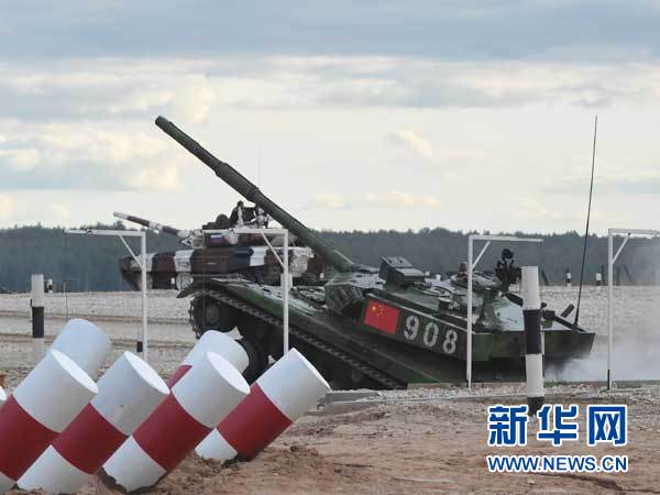 在俄罗斯莫斯科州阿拉比诺军事基地举行的“2015国际军事比赛”总决赛中,中国军队代表队的96A坦克快速通过防坦克壕(2015年8月15日摄)。新华社发(吴苏琳 摄)