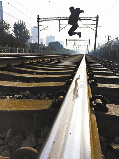 陆某在铁轨上跳起来拍酷照