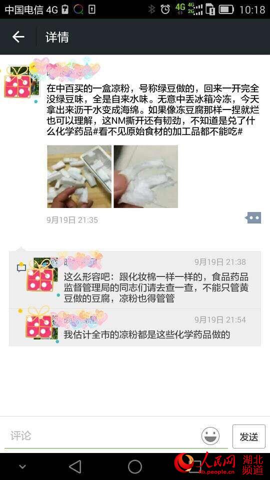 人民网武汉11月5日电 (金雨蒙)近日,食药监康康姐的朋友圈收到了一则消息,一位网友称在中百仓储超市购买的凉粉被冰冻以后,变成了絮状,类似“化妆棉”的质地,于是怀疑其由化学药品勾兑,不能食用。