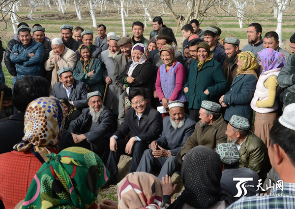 2015年3月24日,张春贤来到莎车县喀群乡且克霍伊拉村的核桃园,在田间地头与乡亲们一起坐在田陇上,向他们了解生产生活情况。