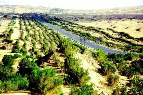 塔里木油田利用太阳能,采用先进节水的滴灌技术,滋养着沙漠公路两旁的植物,抵御着风沙的侵袭。这条公路成为沙漠的“绿丝带”。