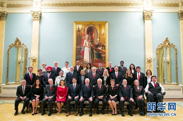 加拿大自由党领袖贾斯汀·特鲁多4日宣誓就任加拿大新一届联邦政府总理,成为加拿大第23任总理。特鲁多宣誓就职后,其内阁的30名部长也紧跟着宣誓就职,其中女性部长占了15人。新华网发(克里斯·卢萨基斯摄)