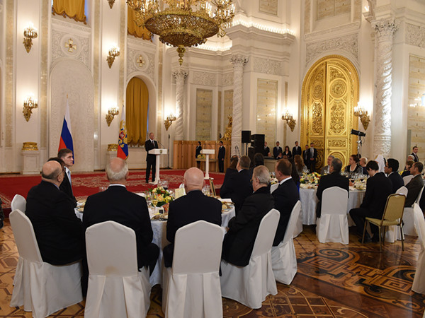 普京在致辞时说,“感谢各位为保护俄罗斯文化、俄语文化财富忘我地工作,正是这些工作使不同大洲、不同国家的人团结到一起。我个人十分高兴授予你们当之无愧的国家奖章!”