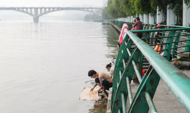 记者于事发第二天清晨探访落水事发地,看到沿江的亲水平台都有一米多高的护栏,要落入水中,必须翻越。事发地岸边多处地方水浅清澈,进入水中后需游出数米才到深水区。