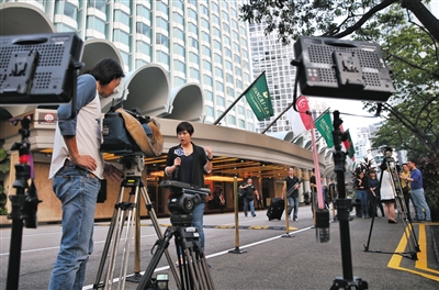 昨日,香格里拉酒店外,媒体记者正在对“习马会”进行“预热报道”。新京报记者薛珺摄