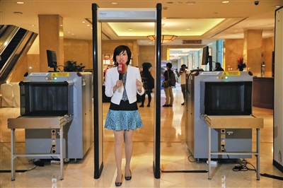 昨日,香格里拉酒店,一名记者正在进行报道,现场已经安装了安检设备。 新京报记者薛珺摄