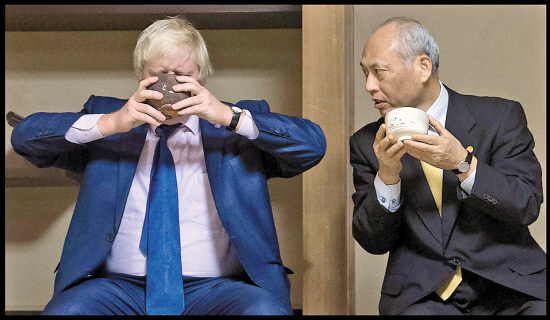 2015年10月,伦敦市长鲍里斯·约翰逊访问日本,东京都知事舛添要一陪同他体验日本茶道。鲍里斯豪气地将茶水一饮而尽,舛添要一望着鲍里斯,一脸愕然。