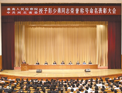 10月9日上午,最高人民检察院、中共河北省委在石家庄召开命名表彰大会,授予保定市检察院党组副书记、副检察长彭少勇同志“全国模范检察官”“全省优秀共产党员”荣誉称号。最高人民检察院党组书记、检察长曹建明,省委书记赵克志出席会议并讲话。会上,曹建明、赵克志分别为彭少勇同志颁发了“全国模范检察官”荣誉证书、奖章和“全省优秀共产党员”荣誉证书。