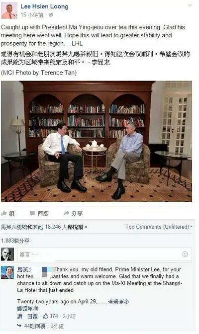 马英九罕见地在李显龙的脸书上点赞并留言——