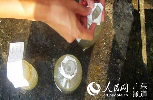 广州番禺警方联合环保部门依法查处一起“农家乐”违反新环保法案件,图为工作人员现场对排放污水进行取样。来源:广州市公安局