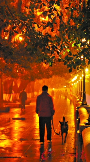 规范动作:一街坊牵着狗绳在滨江路遛狗。