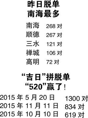 又到“双十一”,不少在爱情路上奋战的单身狗选择在这一天“修成正果”。昨日,佛山选择这一天拉埋天窗的人数很多。市民政局婚姻登记处提供的数据显示,全市有834对情侣结婚登记,远超去年光棍节登记结婚的554对。
