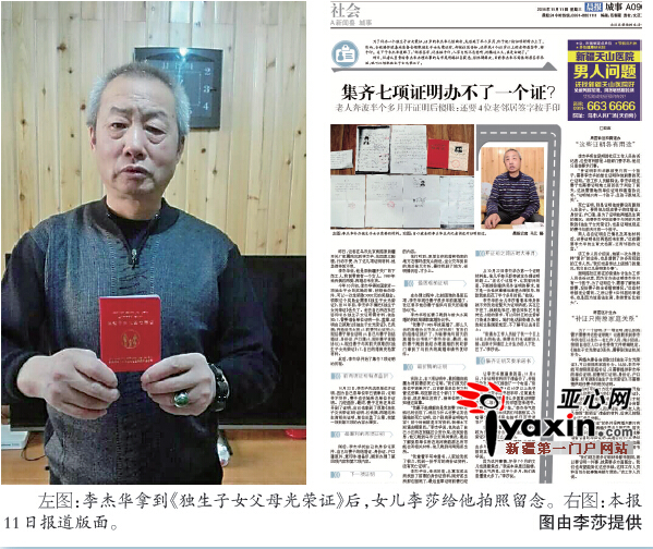 亚心网11月11日刊发《集齐七项证明办不了一个证?》的报道,讲述了61岁的李杰华补办独生子女光荣证的过程。
