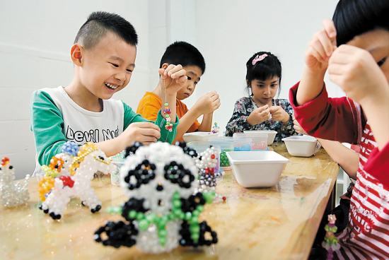“老师会给你们剪一段线,打一个结,然后你们就可以自己穿珠设计手链。”老师话音一落,一只只胖乎乎的小手便一手捏紧如发丝细的线,一只手挑着碗里五颜六色的塑料珠子,一边想一边穿,神情十分专注。