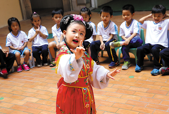 除了学广府手艺,粤语童谣也是云台里幼儿园一直都在传承的。老师把《何家公鸡何家猜》、《排排坐》等童谣改编成午间操,老鹰捉小鸡的游戏也用粤语童谣来配乐。今年3月,云台里幼儿园还举行了“广府文化节”,各班的宝贝轮番上阵,表演了《落雨大》、《醒狮》等节目,小二班的陈彦婷还穿上行当,表演了粤剧《青梅竹马》,让众人称赞不已。已升上中班的小彦婷刚刚参加了“首届粤剧红派艺术大赛”和“南国小红豆青少年粤曲汇演”,小彦婷虽然初次登台却毫无胆怯,把“小红娘”的形象演绎得入木三分,引得满堂掌声。