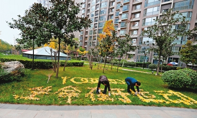 西钞沁园小区绿化保洁人员发挥创意,将落叶摆设成各种图案造型。 记者翟小雪实习生马艺玄摄$$$$$$$$qualitylevel=B