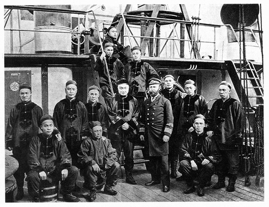“致远舰”官兵合影,中间双手交叉站立者为管带邓世昌