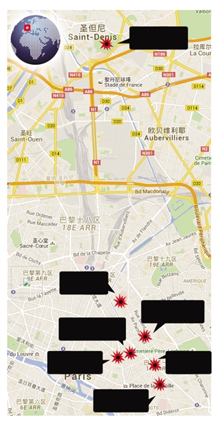 原标题:13日晚发生在巴黎的恐怖袭击,共发生5次爆炸,5次枪击。 其中,法兰西体育场附近发生3次爆炸。