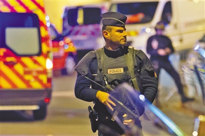 当地时间11月13日,在法国巴黎,警察在法兰西体育场外巡逻。