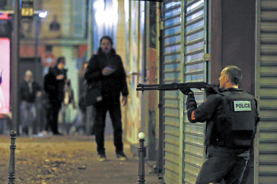 巴黎枪击和爆炸事件现场,警察持枪寻找参与袭击的嫌疑人