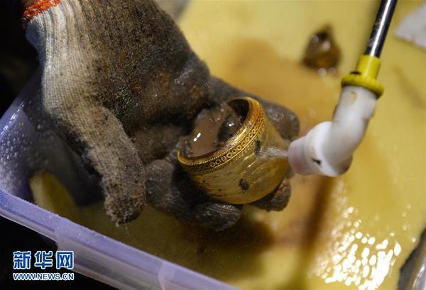 考古人员在清理海昏侯墓出土的马蹄形金器(11月14日摄)。新华社记者万象摄