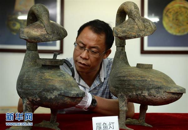 考古人员查看海昏侯墓出土的青铜雁鱼灯(8月6日摄)。新华社记者万象摄