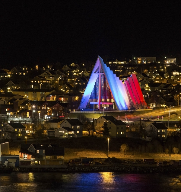 11月14日,挪威特罗姆瑟的北极大教堂亮起代表法国国旗的蓝白红三色灯,悼念巴黎系列恐怖袭击事件中的遇难者。