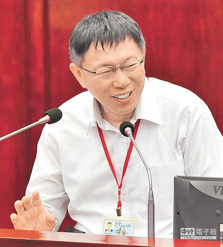 台北市长柯文哲16日出席市议会总质询,民进党市议员高嘉瑜频频称柯为“双北市长”,柯文哲则脱口回答:“他(指朱立伦)明年1月16日之后就会回来当市长了!”(刘宗龙摄)图片来源:台湾《中时电子报》