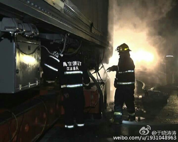 昨晚记者赶到现场时,火已经被扑灭,在夜色中大致可以看出地铁车头的轮廓。在平板车下方,扔着很多矿泉水瓶。据现场人员介绍,他们是从浦镇车辆厂将车头运往马群南京地铁车辆段,跑到这里轮胎因为摩擦起火。因为火在底部不易扑灭,轮胎烧了二三十分钟,将驮着的地铁车身给熏烤了一番,他们将车载灭火器用光后,连矿泉水都用上了,最后消防赶到才将轮胎火扑灭。